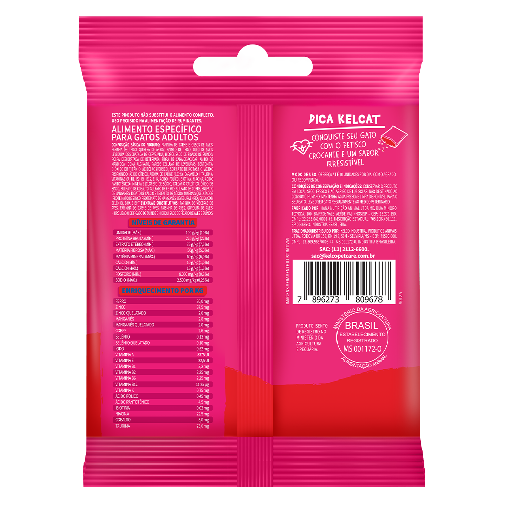 Kelcat Protein Sabor Carne Petisco com 50% de proteína de origem animal, sabor irresistível de carne e livre de transgênicos e corantes artificiais. Nutrição e sabor para agradar seu gato todos os dias.